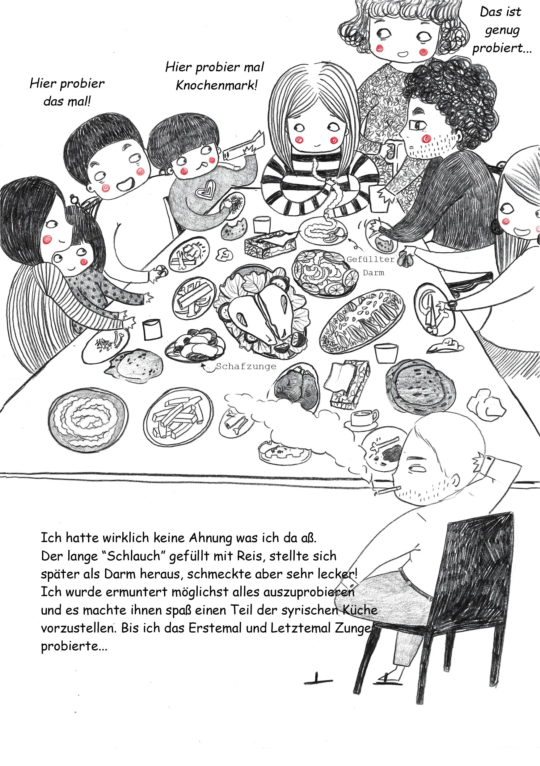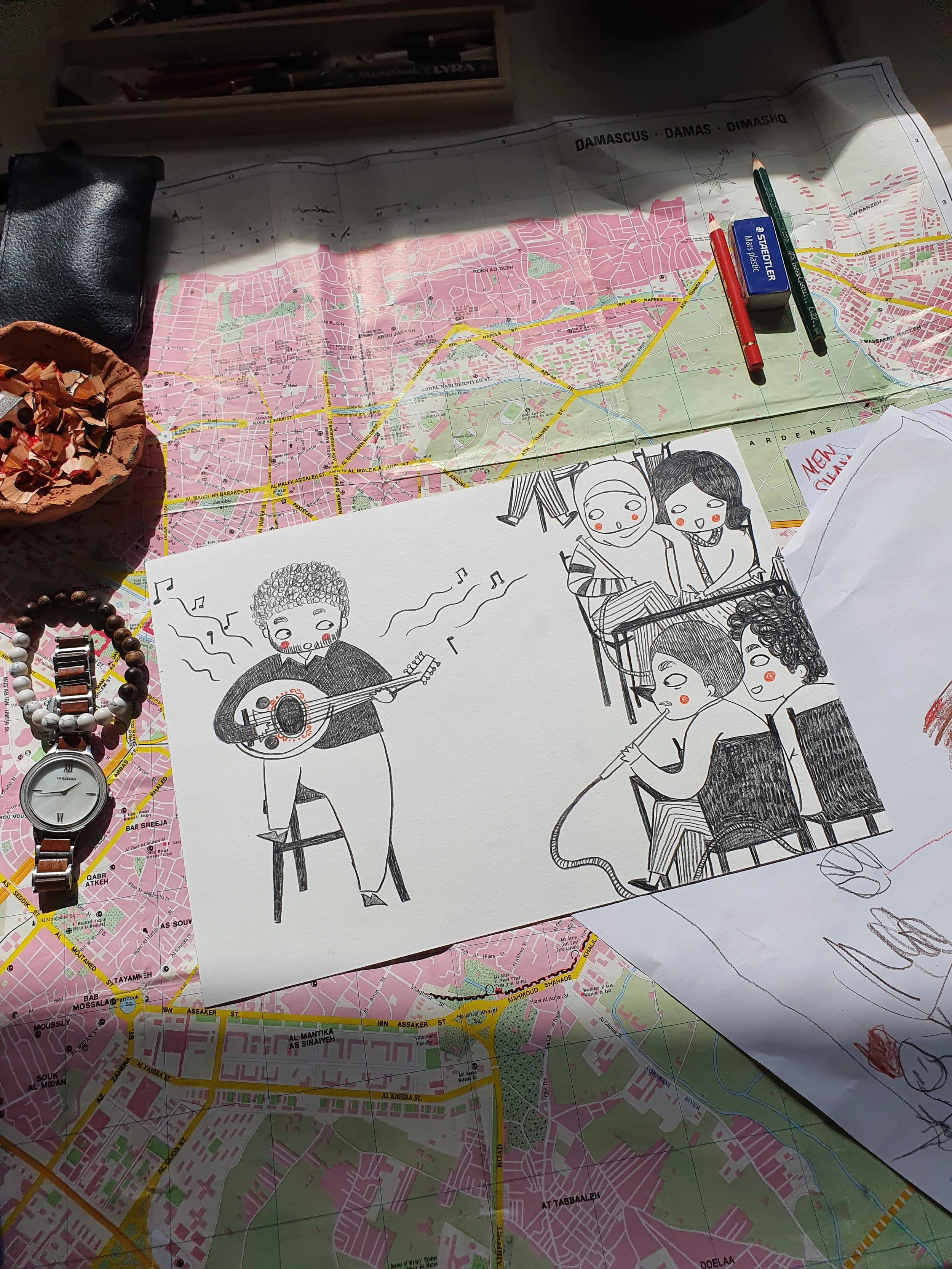 I spent many years in Syria from 2005 to 2011. Even back then, I had the idea of painting what I experienced. After the war began and my two children were born, I decided to truly start this project—initially as something small and personal, a way to bring Syria a little closer to my children. In this way, I created many one- to two-page paintings that capture different experiences of everyday life.